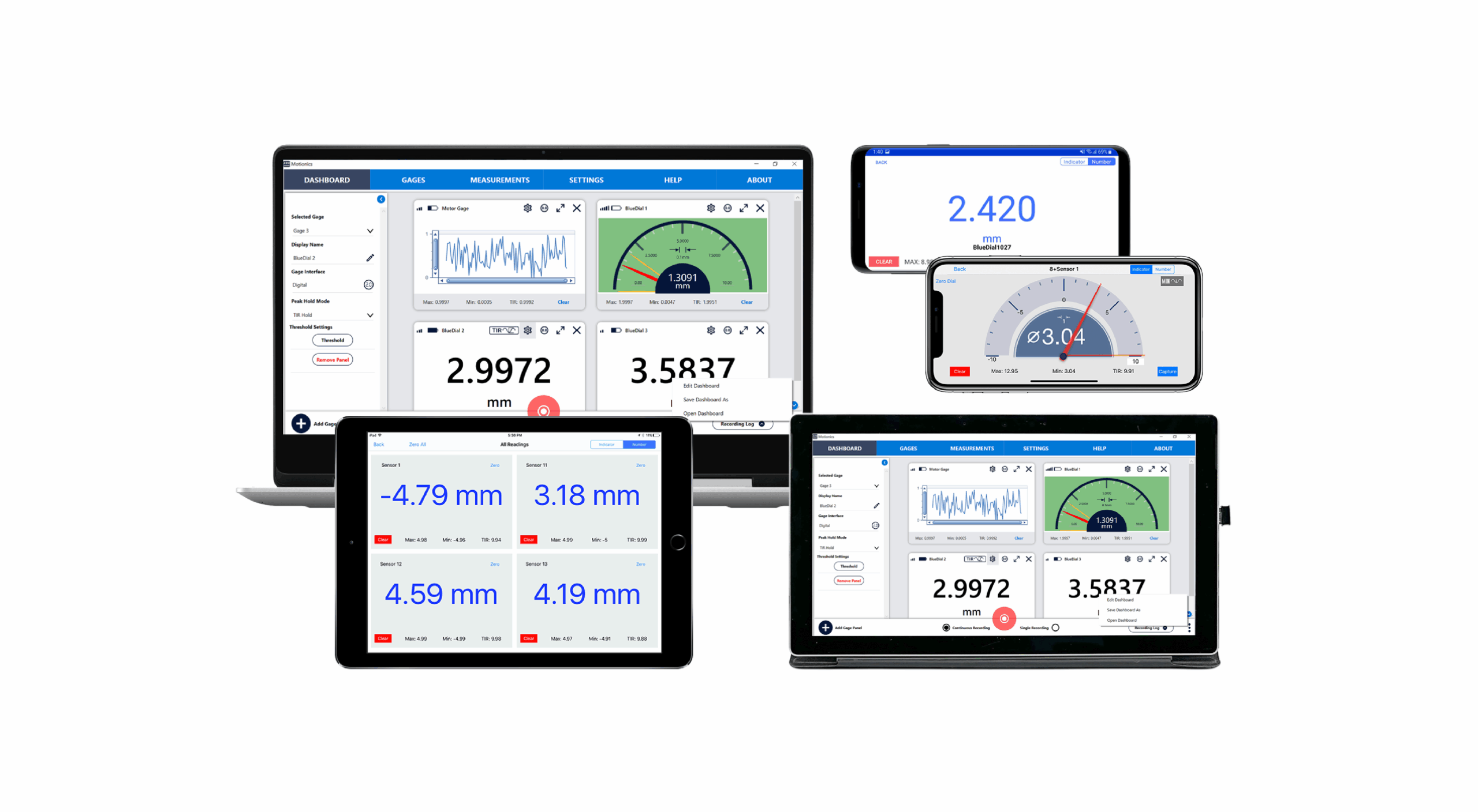 MultiGage wireless measurement software displaying real-time data from Bluetooth dial indicators and sensors on multiple devices including laptop, tablet, and smartphone