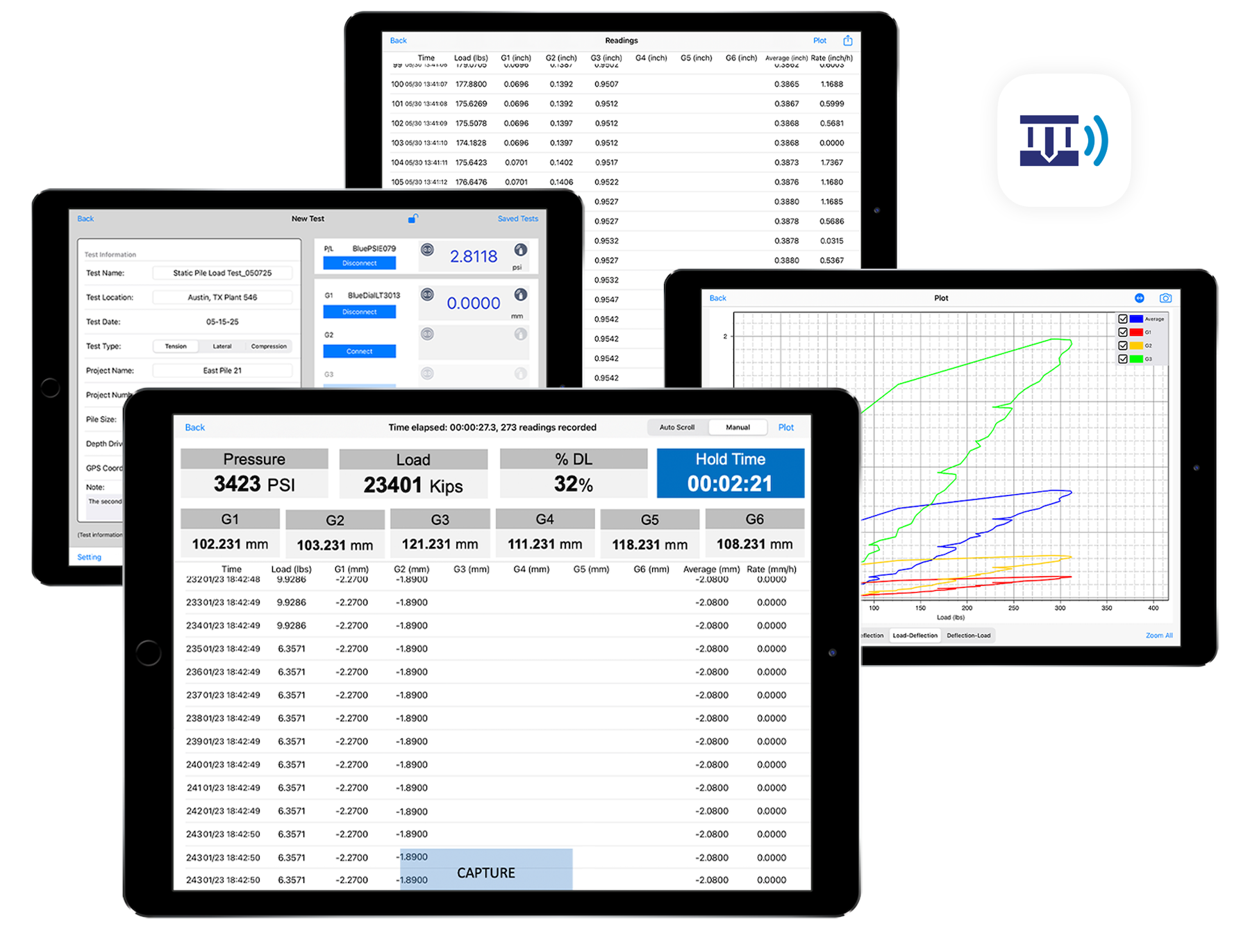 - Configure your setup by choosing from a selection of wireless gauges and devices, including BlueDial Bluetooth dial indicators, BluePSI pressure sensors, and Bluetooth load gauges. All PileSense™ sensors sync seamlessly with our easy-to-use PileSense app for iPad or MultiGage mobile and PC software, delivering synchronized real-time data updates for more accurate analysis.
