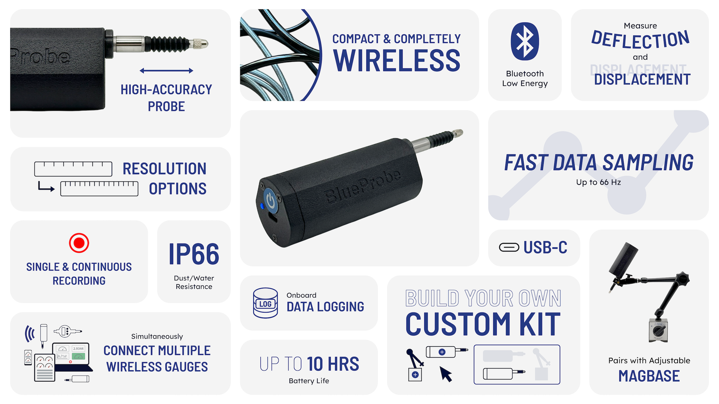 Powered by a rechargeable battery, BlueProbe combines portability, precision, and flexibility, making it an ideal tool for engineers and technicians who require reliable, high-accuracy measurements in realtime without the need for messy cables.