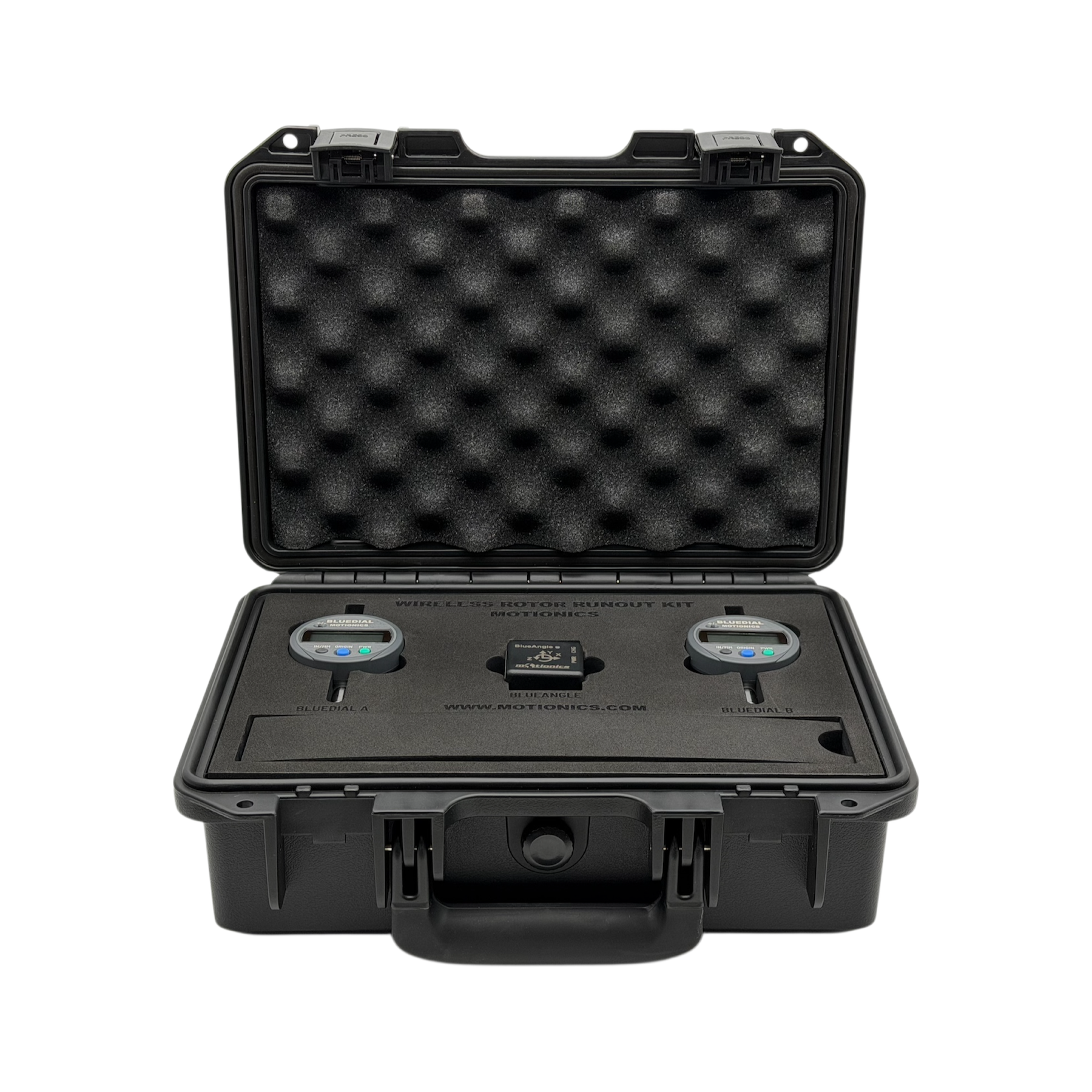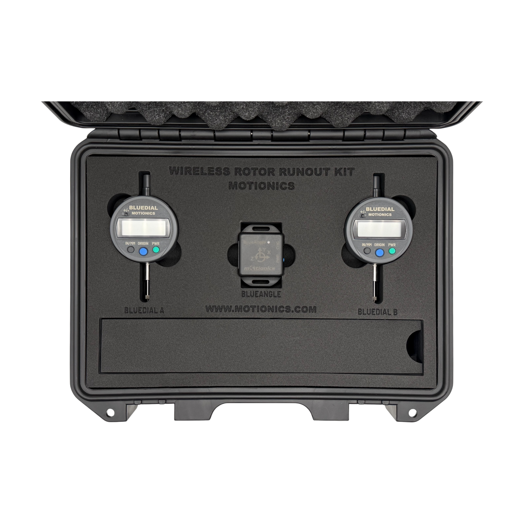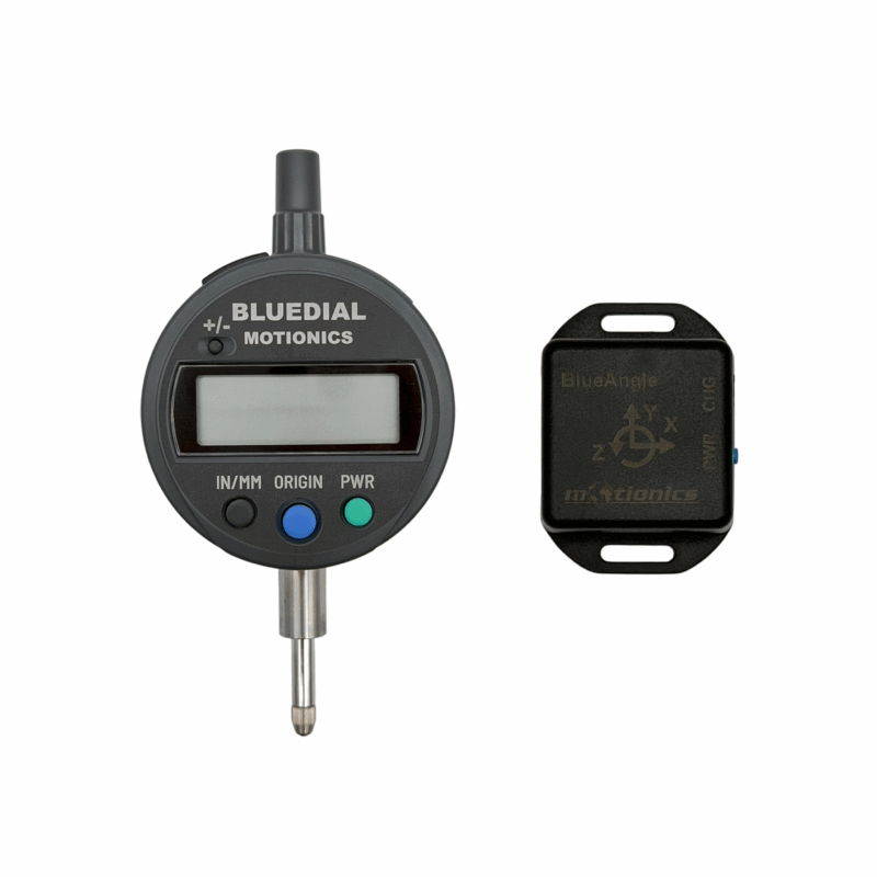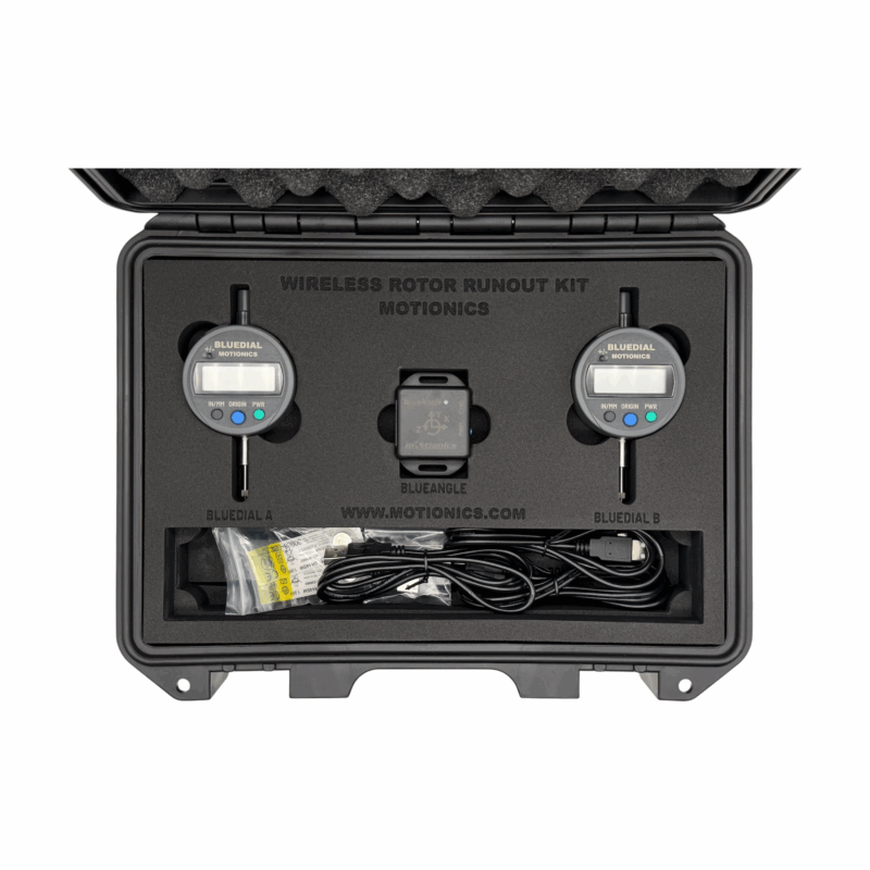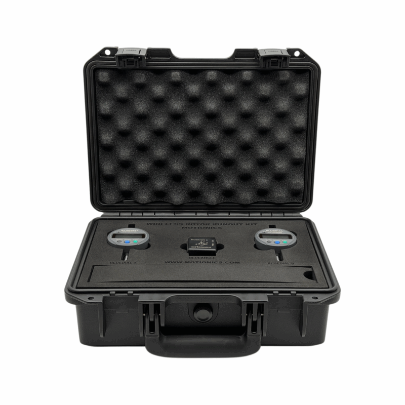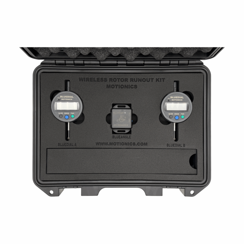 Motionics Wireless Rotor Runout Kit consists of a Bluetooth dial indicator BlueDial, a Bluetooth angle sensor BlueAngle and the iPad application Runout.